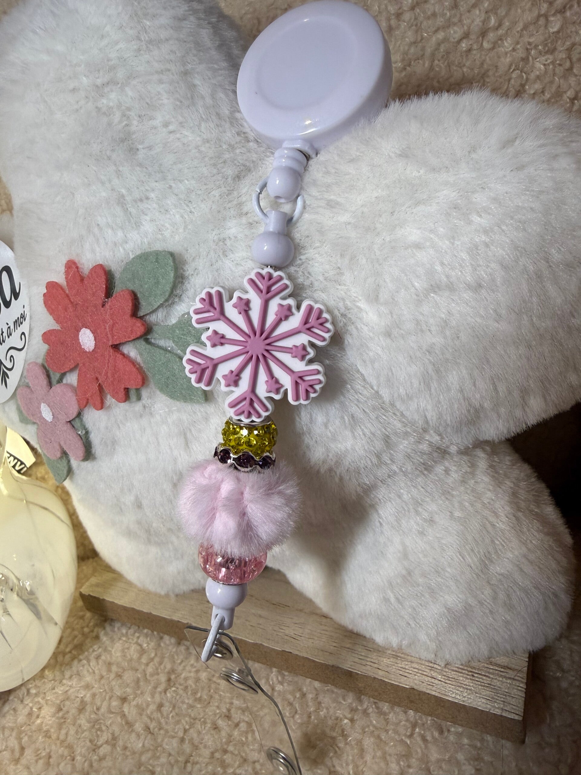 Porte badge perlés plastique rectractable jusqu'à ~ 65cm, accroche blanc (~3,2cm) avec pince en métal.