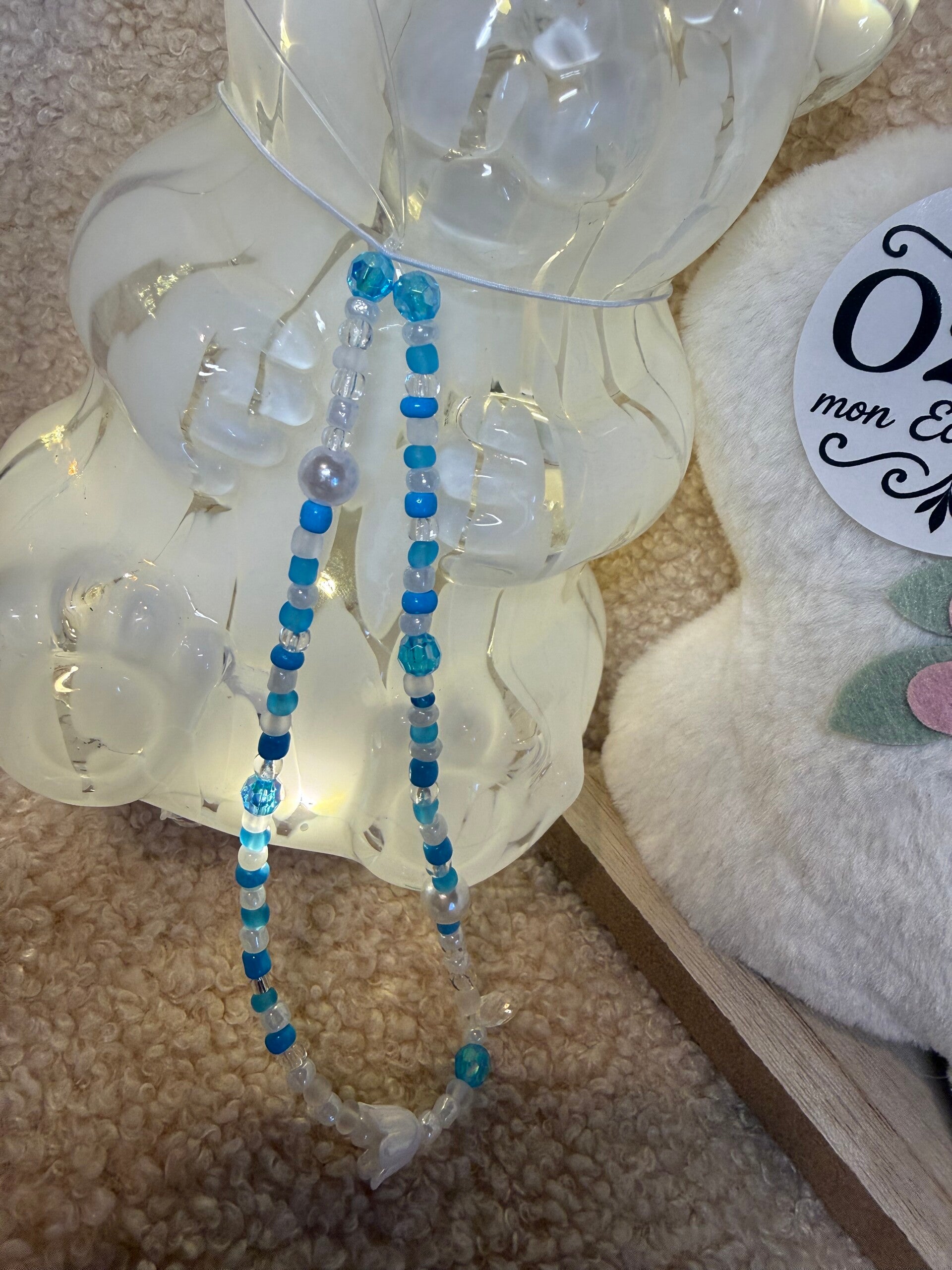 Bijou de téléphone, perle acrylique bleu et blanc.
